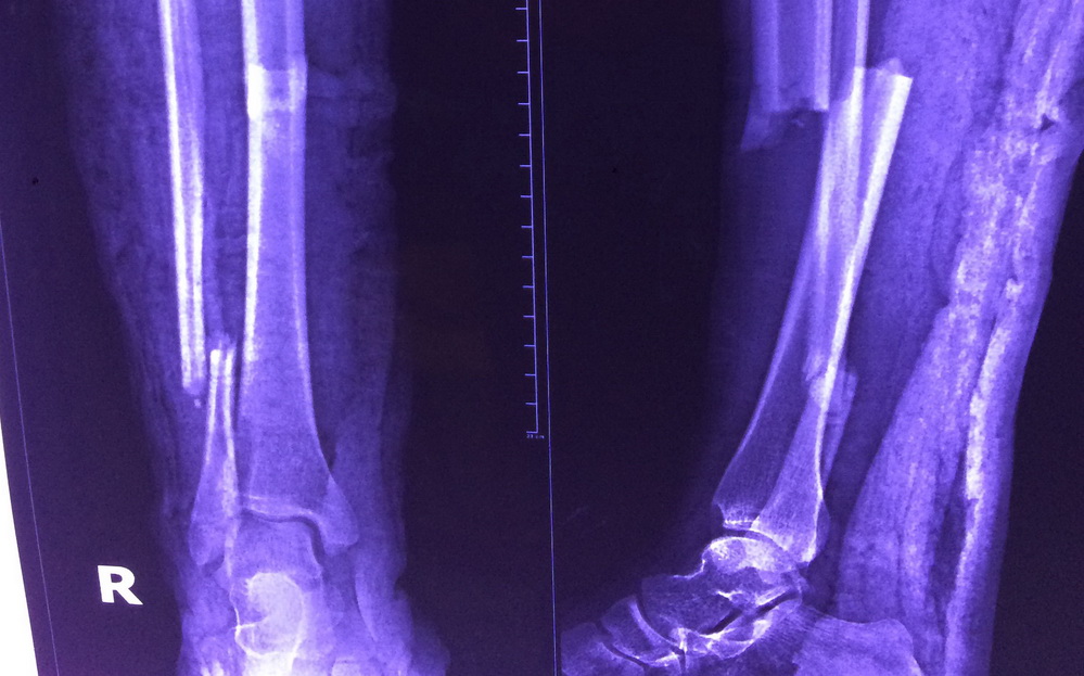 Các bác sĩ ghi nhận bệnh nhân bị gãy xương cẳng chân bên phải (đoạn ống quyển) thành 2 đoạn phức tạp, ca mổ nguy hiểm vì chỉ cần đi một bước lên cầu thang bệnh nhân đã khó thở, tím tái.