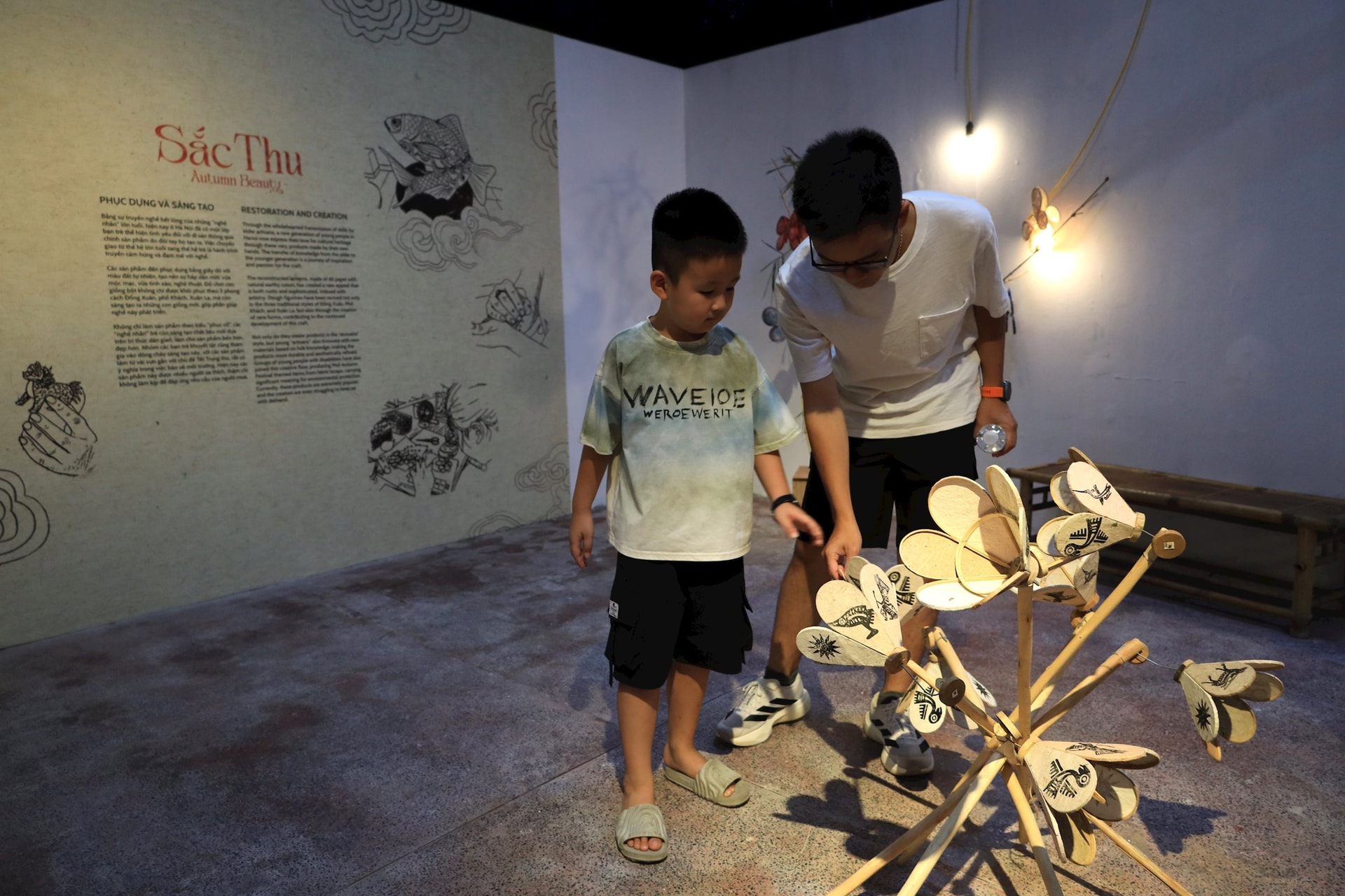 Không gian “Sắc Thu” gợi nhắc bao ký ức về Trung thu xưa. Người xem được tận mắt chiêm ngưỡng, thậm chí tự tay thử làm, từ mặt nạ giấy bồi của phố Hàng Than, hoa quả bột Đồng Xuân, tò he Xuân La cho đến tàu thủy sắt tây Khương Hạ. Những vật liệu quen thuộc như tre, nứa, giấy, bột gạo, vỏ hộp sữa... dưới bàn tay khéo léo của nghệ nhân trở thành đồ chơi vừa gần gũi vừa lung linh.