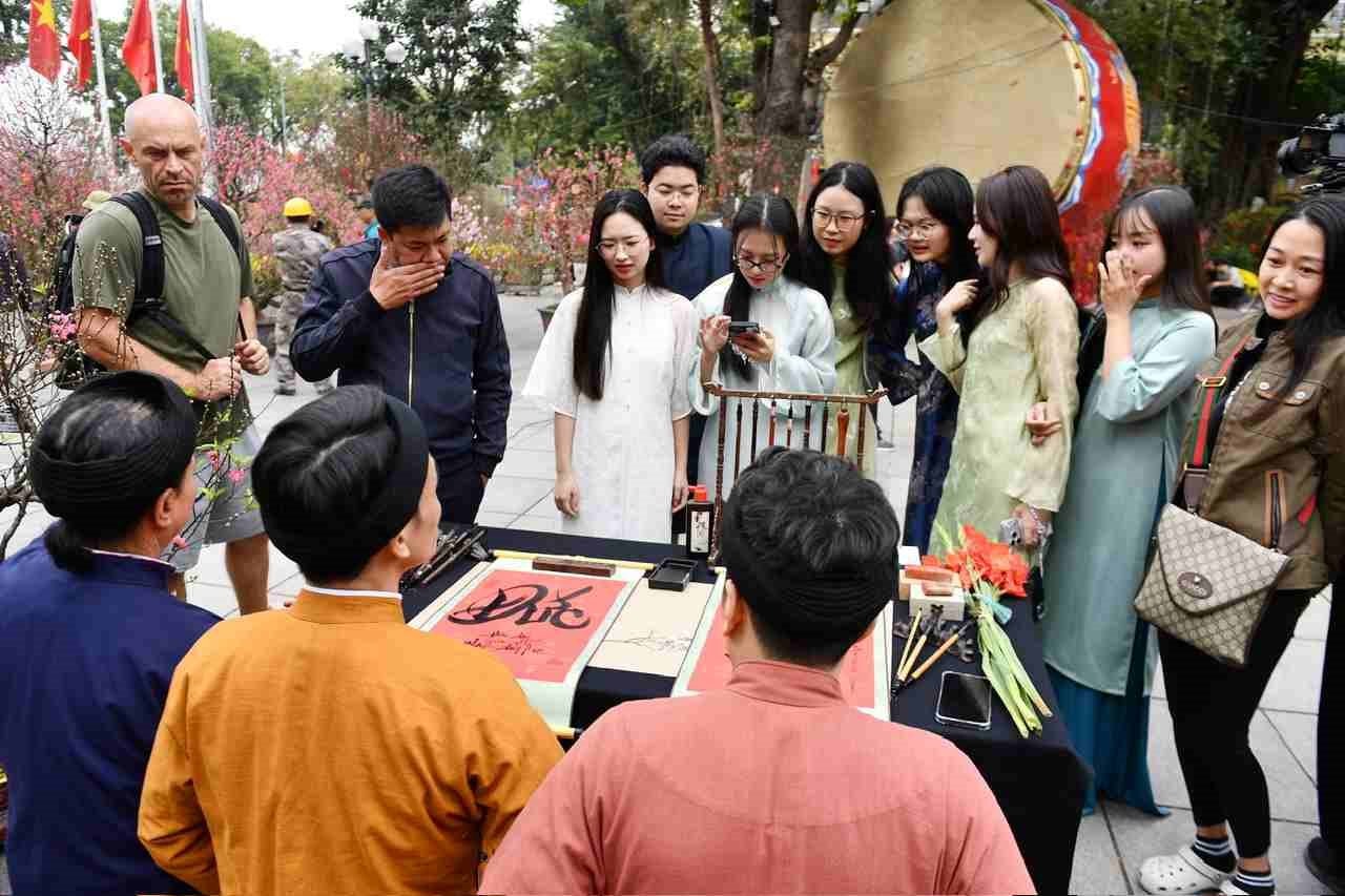 Bên cạnh việc thưởng lãm không gian hoa xuân rực rỡ giữa lòng Thủ đô, du khách đến với vườn hoa Lý Thái Tổ năm nay còn được trải nghiệm nét văn hóa xin chữ ông đồ đầy ý nghĩa. Trong không gian rực rỡ sắc đào quất, những nét chữ phượng múa rồng bay như nhịp cầu nối dài những lời chúc bình an, may mắn cho một "mùa xuân của kỷ nguyên mới". Hình ảnh những tà áo dài thướt tha bên mực tàu, giấy đỏ càng làm tôn lên vẻ đẹp thanh lịch của người dân Thủ đô giữa không gian di sản. Chị Minh Xuân (Quận Hoàn Kiếm), một du khách có mặt từ sớm, chia sẻ: "Tôi thực sự choáng ngợp trước quy mô của không gian hoa năm nay. Không chỉ có hoa đẹp, việc đưa các hoạt động truyền thống như xin chữ vào giữa trung tâm Hồ Gươm khiến không khí Tết như đậm đà hơn. Đây chắc chắn là điểm check-in ấn tượng nhất Hà Nội mùa xuân này."