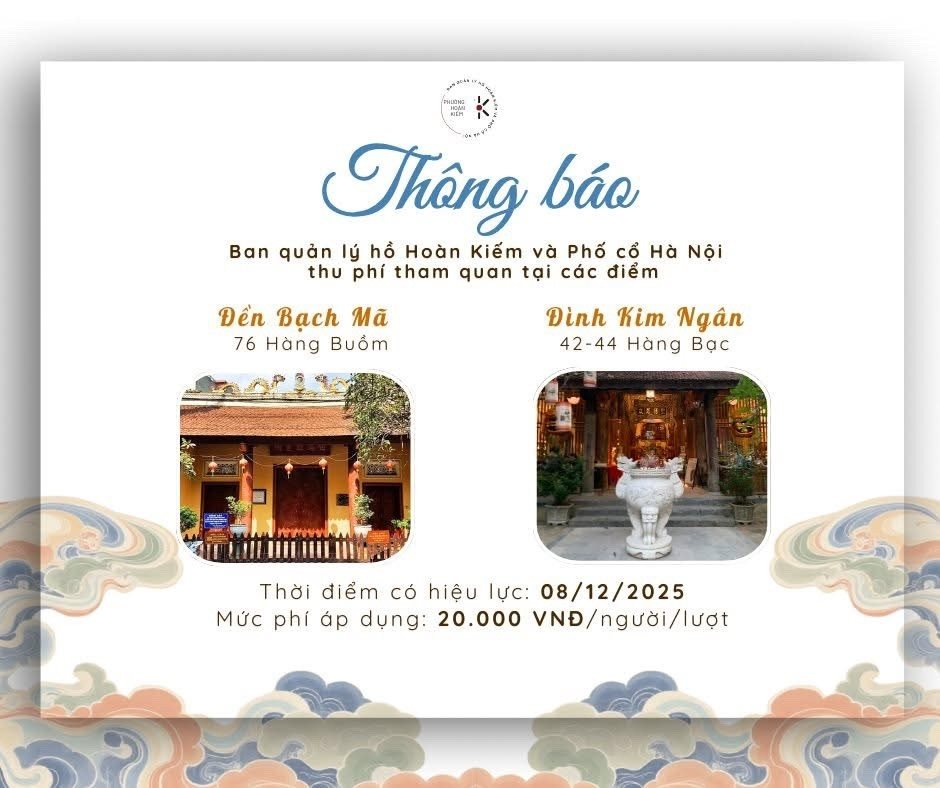 Từ ngày 8/12/2025, khách tham quan đền Bạch Mã và đình Kim Ngân sẽ phải mua vé với mức giá 20.000 đồng/lượt. Việc thu phí được Ban Quản lý hồ Hoàn Kiếm và phố cổ Hà Nội triển khai theo Nghị quyết số 66 ban hành ngày 27/11 của HĐND TP. Hà Nội.