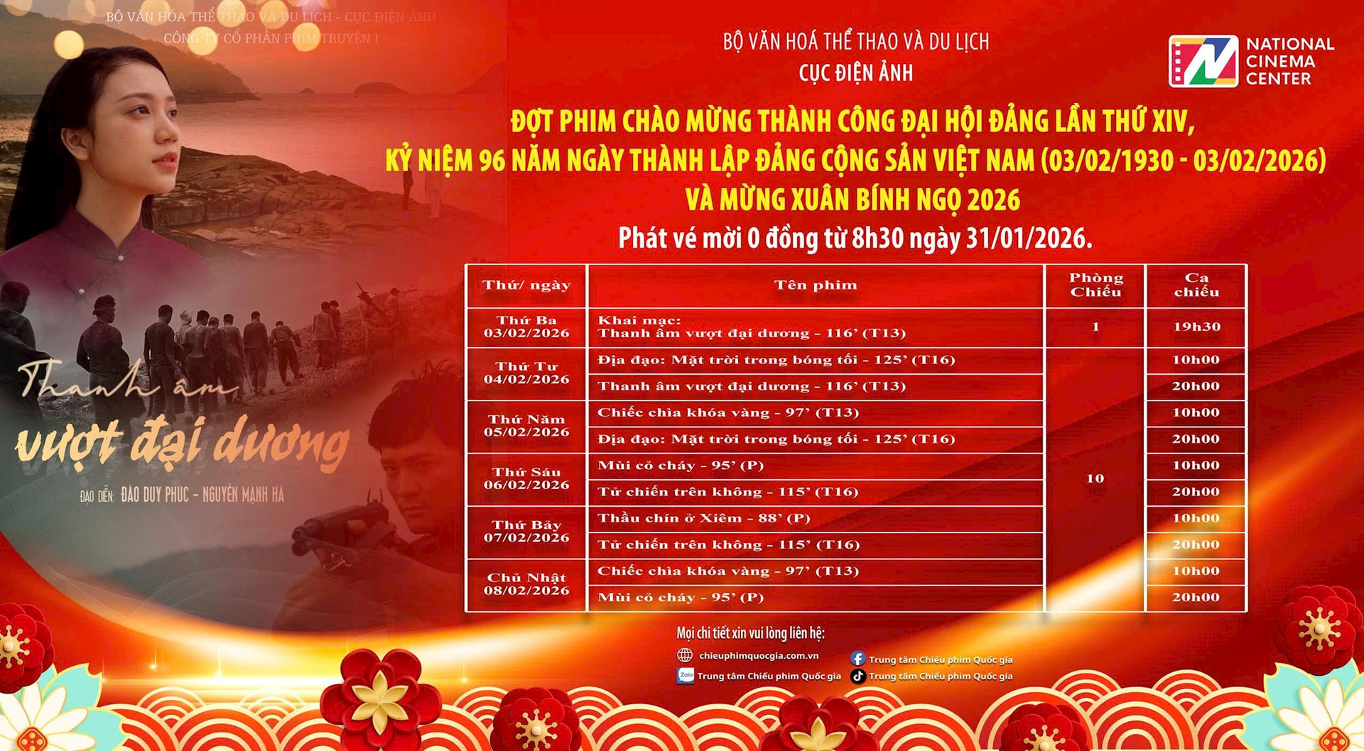 Từ ngày 3/2 đến ngày 22/2/2026, Đợt phim chào mừng thành công Đại hội Đảng lần thứ XIV, kỷ niệm 96 năm Ngày thành lập Đảng Cộng sản Việt Nam (3/2/1930 - 3/2/2026) và mừng Xuân Bính Ngọ 2026 sẽ được tổ chức trên phạm vi cả nước với việc trình chiếu nhiều tác phẩm điện ảnh có giá trị tư tưởng và nghệ thuật.