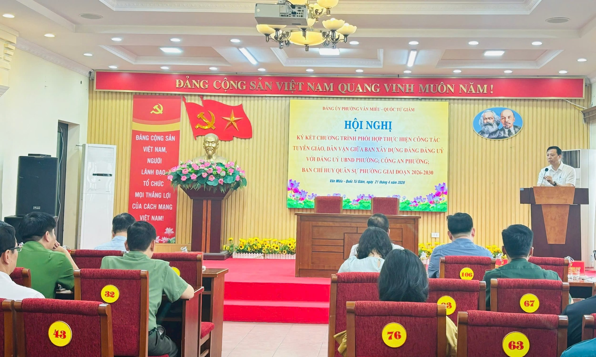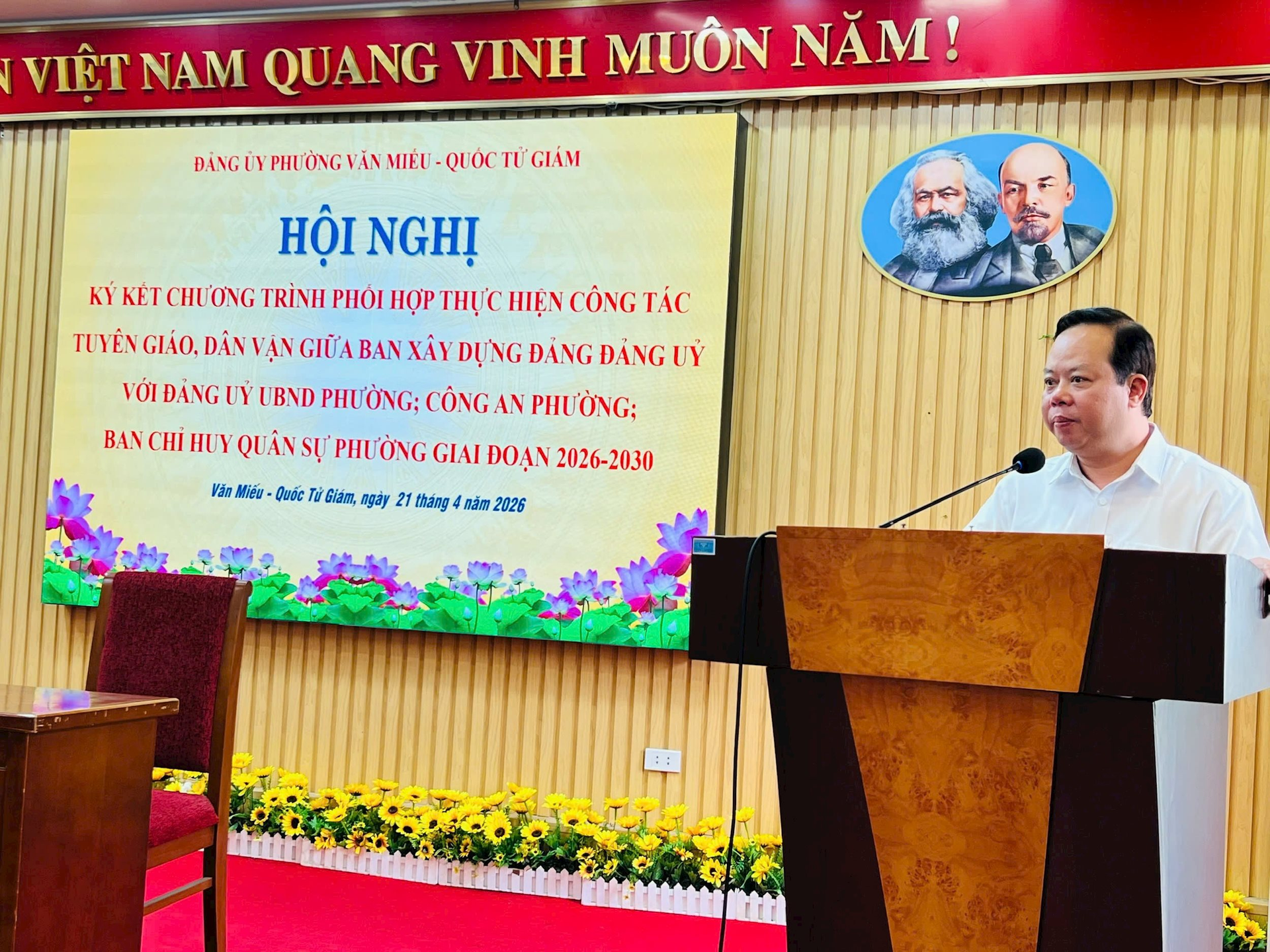 Phát biểu tại Hội nghị, đồng chí Đỗ Trọng Nam - Bí thư Đảng ủy, Chủ tịch HĐND phường nhấn mạnh ý nghĩa quan trọng của việc ký kết, yêu cầu các đơn vị bám sát nội dung chương trình đã thống nhất, cụ thể hóa thành các nhiệm vụ, giải pháp thiết thực; tăng cường phối hợp chặt chẽ, thường xuyên kiểm tra, đánh giá kết quả thực hiện, bảo đảm các nội dung đi vào thực chất, hiệu quả, góp phần nâng cao chất lượng công tác tuyên giáo, dân vận, tạo sự đồng thuận xã hội, góp phần xây dựng Đảng bộ phường Văn Miếu - Quốc Tử Giám ngày càng trong sạch, vững mạnh.