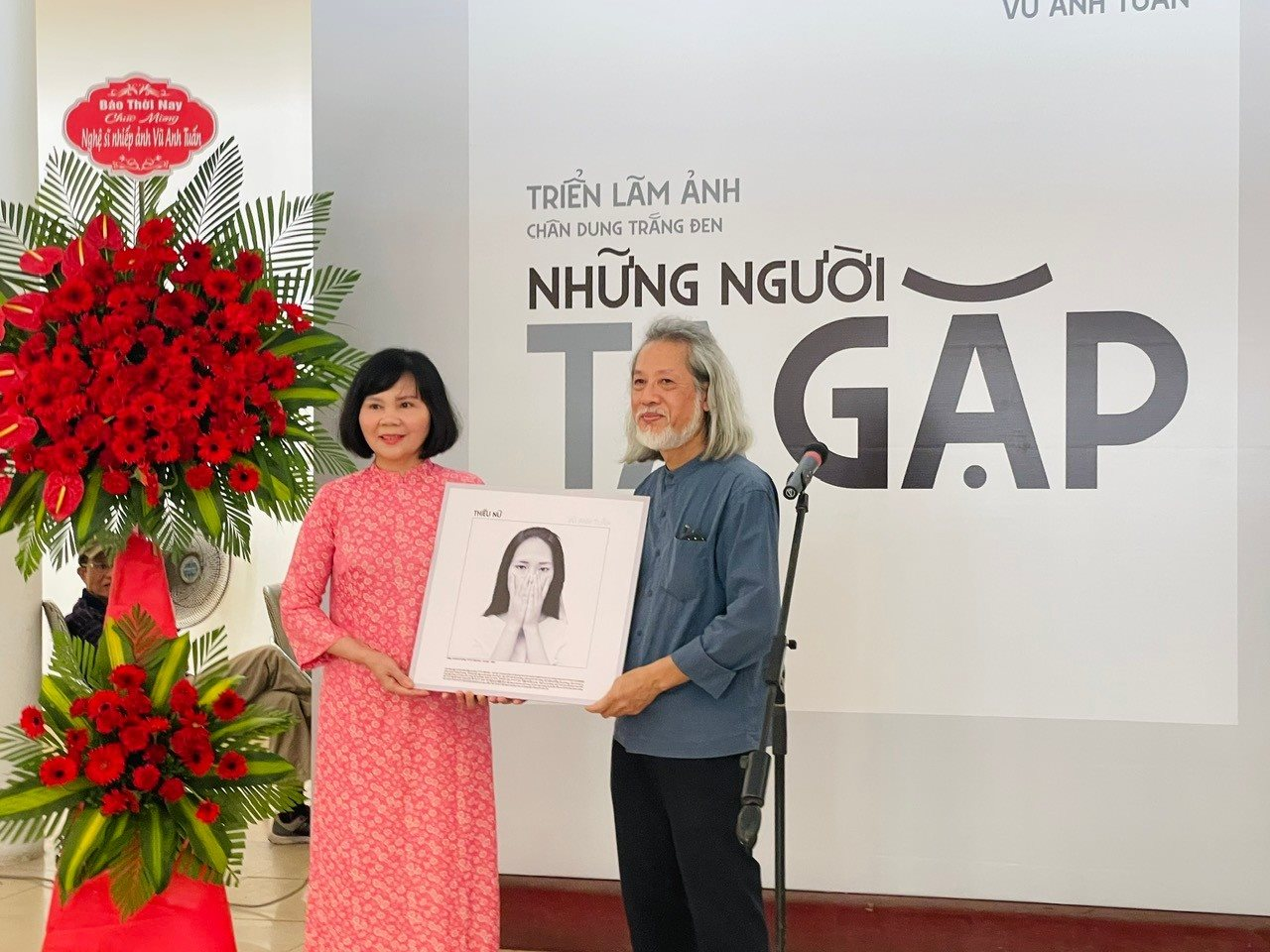 NSNA, nhà báo Vũ Anh Tuấn trao tặng ảnh cho đại diện Bảo tàng Phụ nữ Việt Nam tại lễ khai mạc triển lãm.
